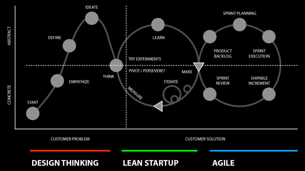 – « Faire » : cette étape tend à développer le MVP (produit minimum viable). L’équipe organisée et agile aboutit, au cours de plusieurs sprints, à une première version du projet. Dans les itérations suivantes, l’objectif est d’améliorer le produit ou la solution en gardant les mêmes principes directeurs. Souvent, l’équipe est organisée en « Scrum », ce qui permet à l’ensemble des personnes d’obtenir une vision claire de l’état d’avancement des travaux et de la quantité de travail restante.