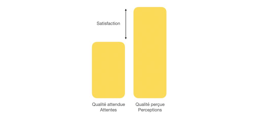 Notre satisfaction, c’est la différence entre nos attentes et la perception réelle de la qualité du produit ou du service. Forcément, notre satisfaction est plus importante lorsque nos attentes sont faibles que lorsque nos attentes sont très élevées.